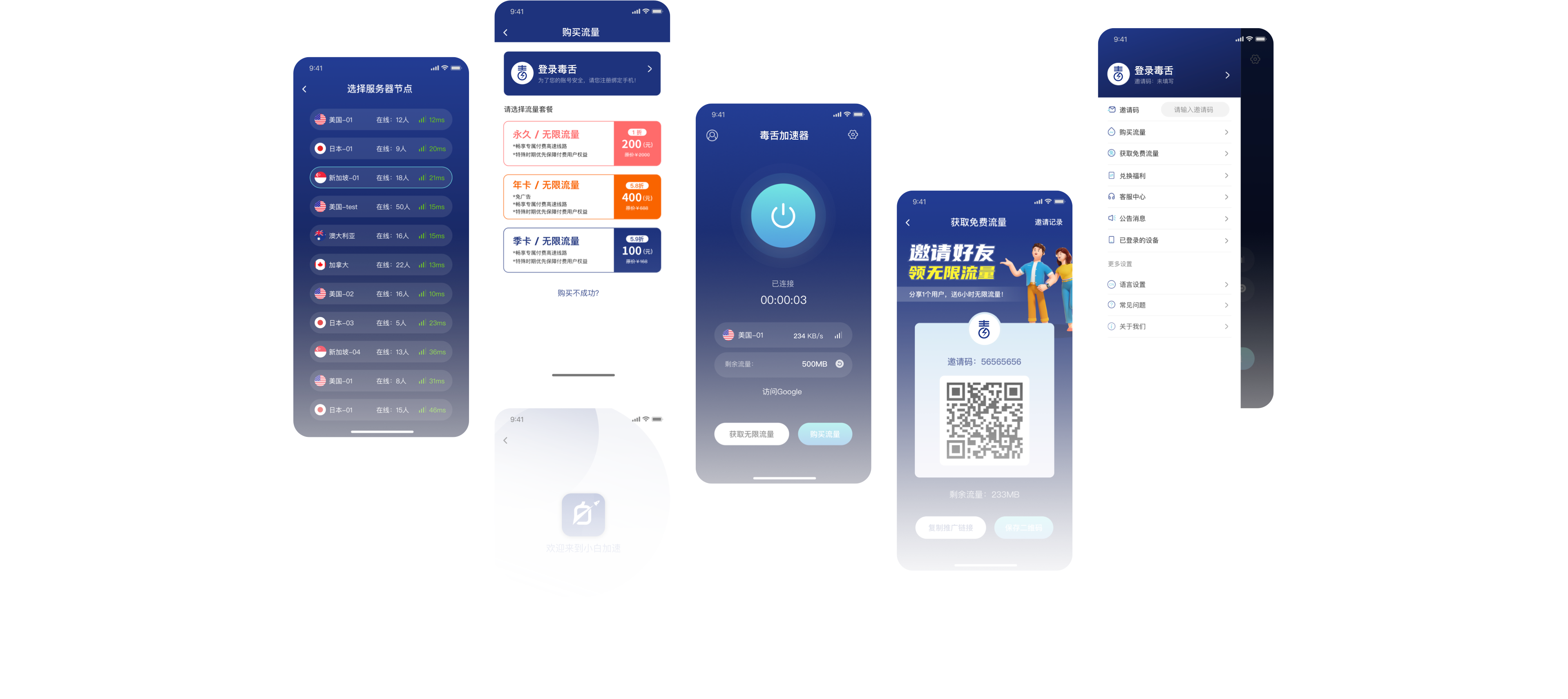 打开毒舌加速器APP,进入首页点击分享按钮进入分享页面;通过下面两个按钮分享成功邀请一人可得6小时无限流量使用, 依次累加两人可得12小时无限流量。